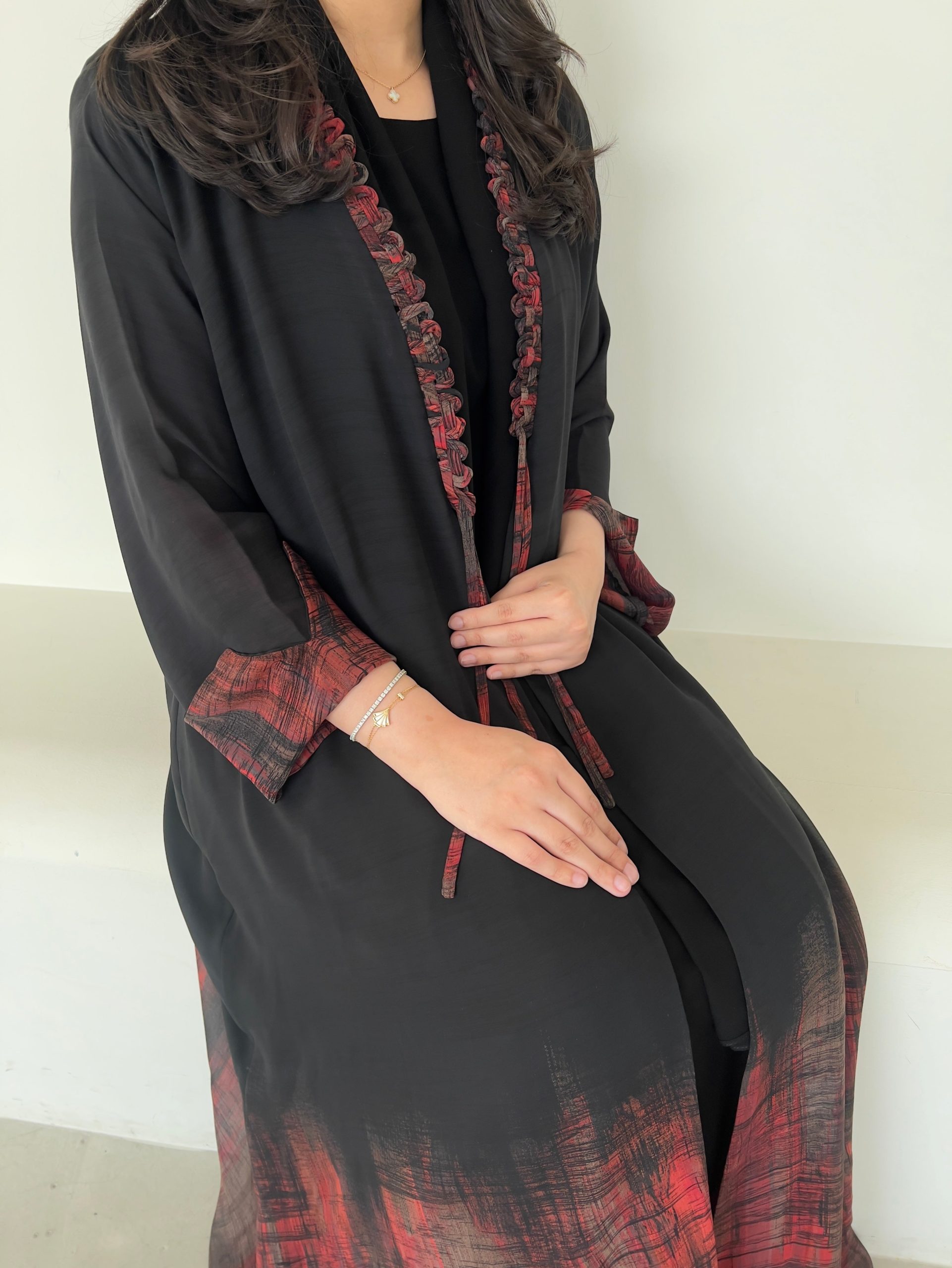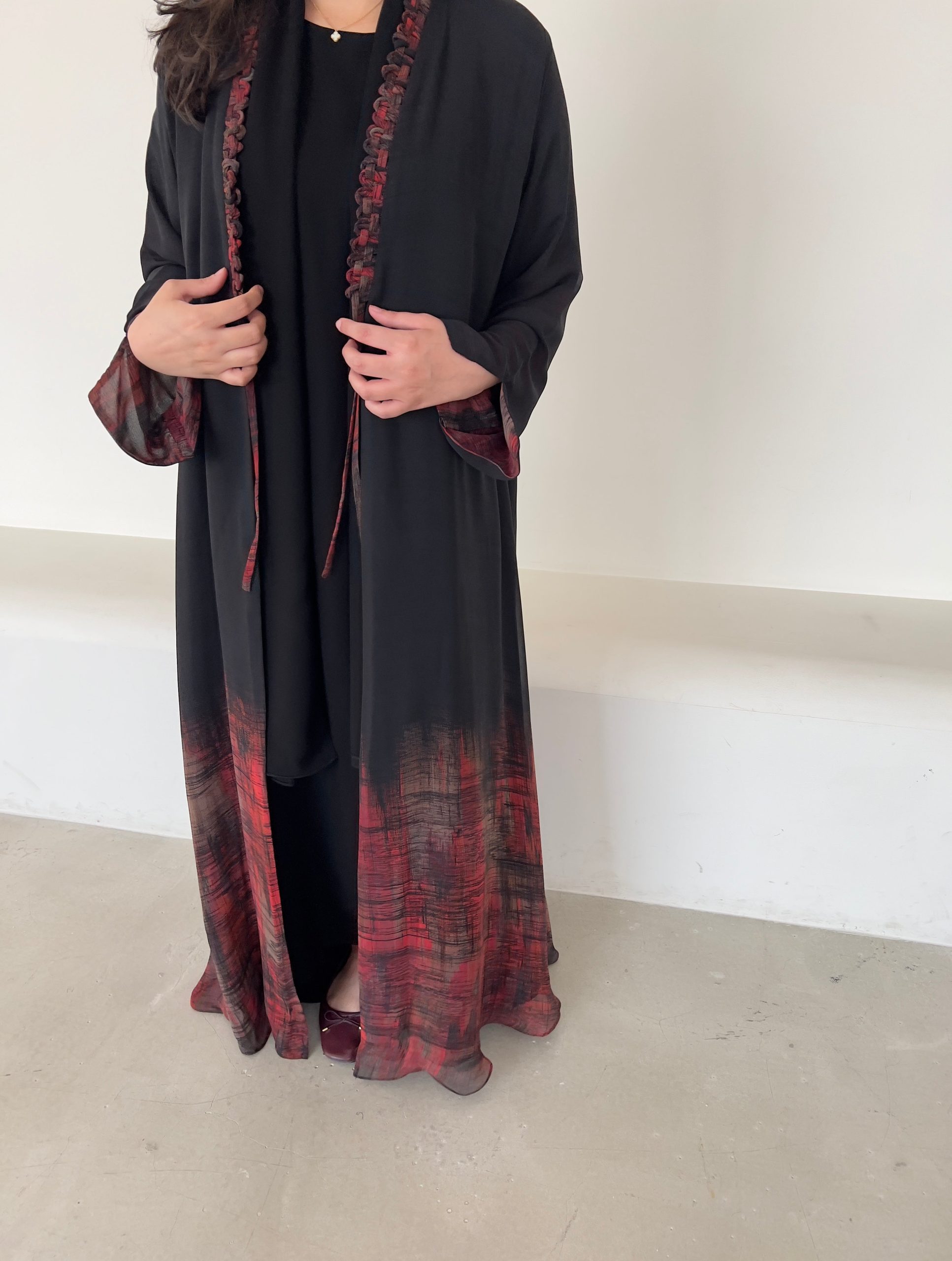 Abaya en mousseline de soie avec détails imprimés colorés à l’extrémité et col tressé